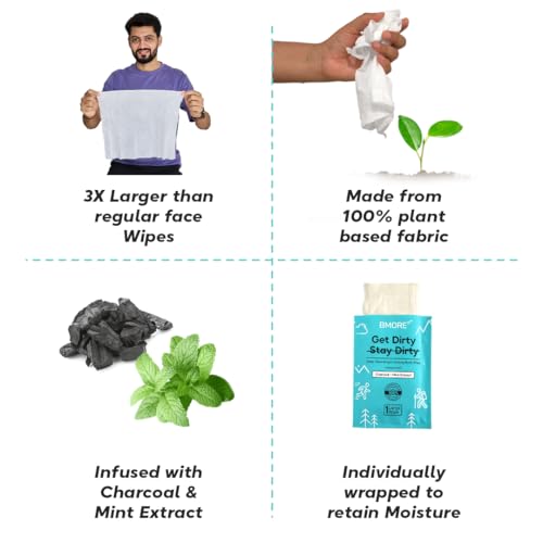 BMore Biodegradable Individually Wrapped Face and Body Wet Wipes | Large 30×30 cm | Daily Use Travel and Outdoor Eco Bath Wipes | Charcoal and Mint Pocket Wipes (Pack of 5)