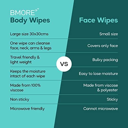 - Individually Packed Large Size Wet Wipe. Bmore Face and Body Wipes are individually wrapped for your convenience and also to prevent drying and wastage. The 30 x 30 cm ensures effective cleansing with just one wipe.