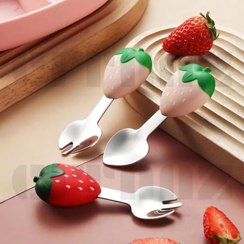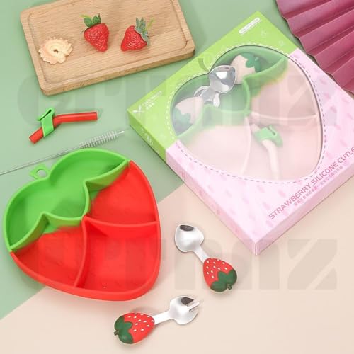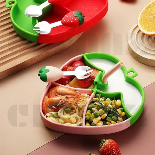 Citaaz Silicone Baby Feeding Set Includes Toddler Plates, Toddler Forks and Spoons Toddler Feeding Supplies – Non-BPA Plates with Straw, Brush – Cute Food Plate (Strawberry Pink)