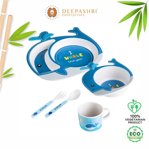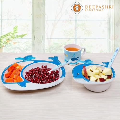 Deepashri™ Baby Feeding Essentials Set |Soft Spoon & Fork – Divided Suction Plate, Suction Bowl, Sippy Cup, BPA-Free, Dishwasher Safe – Whale Blue (Set of 5).
