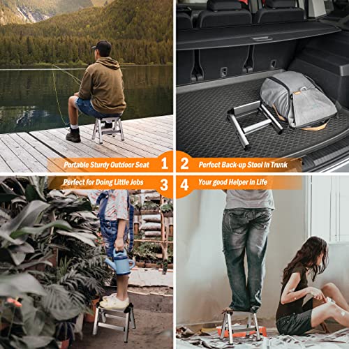 • ?Tiny & Versatile?- The metal stool is both handy and solidly constructed, It serves as a portable work stool for indoor tasks: cleaning painting, or little boost for reaching high objects at home. It's also a great choice for outdoor activities such as camping or fishing where it can be used as a step stool or a seat. The stool is foldable and easy to store in your car, trunk, SUV or RV without taking up too much space, making it a practical and helpful tool for a variety of situations.