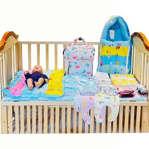 - Pack contains: 1.Baby Sleeping Bag 2.4 Waterproof sheet 3.1 Hand Carry Bed 4.6 Shirts | 6 Caps | 6 Nappies (0-3M) 5.6 Mittens | 6 booty mittens 6.3 Muslin blankets 7.6 Nappy 8.6 Napkins 9.2 Bibs 10.1 Mother Bag Total 54 Items.