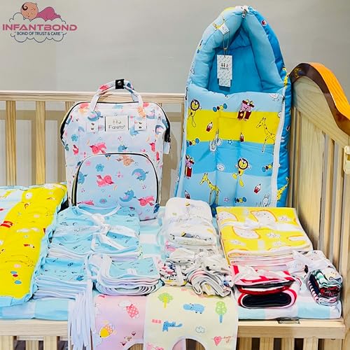 Infantbond Baby Products All New Born Combo | Baby Combo Set for New Born | 54 in 1 Hospital Essentials Kit | Baby Essentials for Newborn (Summer Season)(0-6 Months)(Blue Giffi)