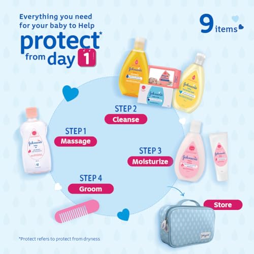 - Moisturize with: Johnson's baby lotion and Johnson's baby cream- Helps protect from dryness to keep baby's skin soft Groom with Baby Comb-made with rounded edges, especially for baby's delicate scalp Store baby essentials in a portable, water-resistant baby pouch