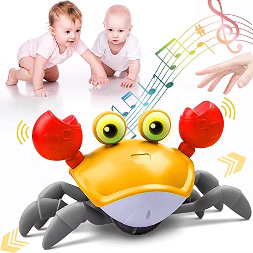 - ? Fun and Smart Crab Toy: Adopted advanced infrared technology, this crawling crab is super fun for babies to play with – it will crawl away to opposite direction when it encounters an obstacle. It is a super fun interactive toddler toy to encourage babies to crawl. It moves fast, skitters sideways like a real crab, and plays fun sounds and music and lights up. Note: Do not use this toy on carpet, in water or humid environments.
