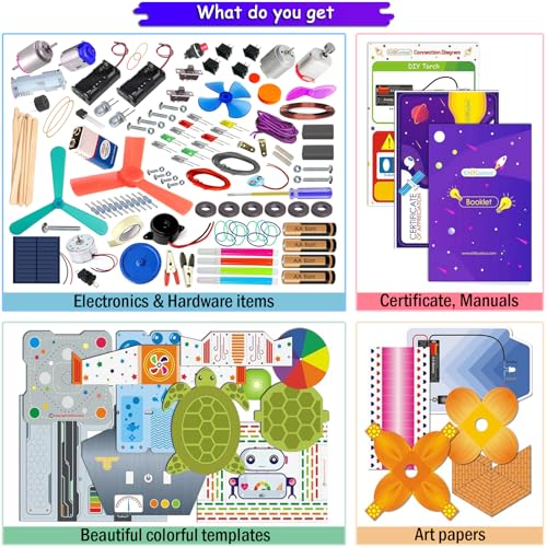 - 150 reusable items: Kit includes plenty of components like Solar plate, solar motor, switchs, buzzer, wires, different type motors, AA holder, AA battery, 9v connector, 9v battery, Magnets, different type fans, nut bolts, LED lights of various colors, transistor, multiple switches, connecting clips, copper wire, screw driver, colorful templates cut-outs, Connection diagram, project booklet and appreciation certificate.