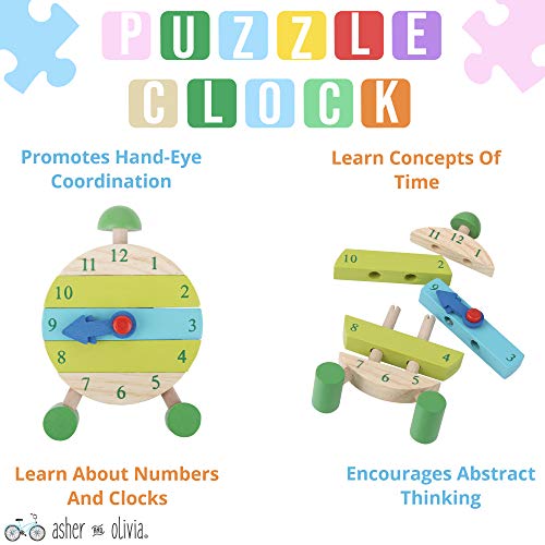 - All-In-One Educational Set – Asher & Olivia’s exclusive Numbers Puzzle Set features multiple preschool learning games inspired by Montessori teaching techniques including a Montessori puzzle board, a 5-piece stackable Learning Clock and 2 Lacing Toys that fit seamlessly between all of the puzzle pieces or lacing beads; Our wooden number puzzle for toddlers is ideally sized measuring 15.7 inches Long, 6 inches Wide and 3 inches Tall while each chunky piece is sized for an easy grasp and lace