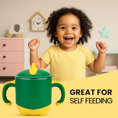 - Ergonomic Design for Toddlers: Crafted with dual easy-to-grip handles, this baby sipper cup for 1-year-olds helps toddlers transition from bottles to regular cups, promoting independent drinking. The design makes it compatible with other baby feeding essentials, including baby water bottles and steel sipper bottles for kids. A thoughtful gift for baby showers, first birthdays, or new moms.
