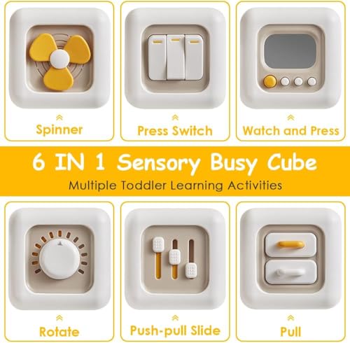 • ?6-in-1 Busy Board Cube?This cognitive toy integrates 6 learning activities including on-off button, open-close drawer, twist timer, shift regulator, TV mirror and spinning fan. The Ideal Montessori toy for 1-3 year old babies and toddlers.