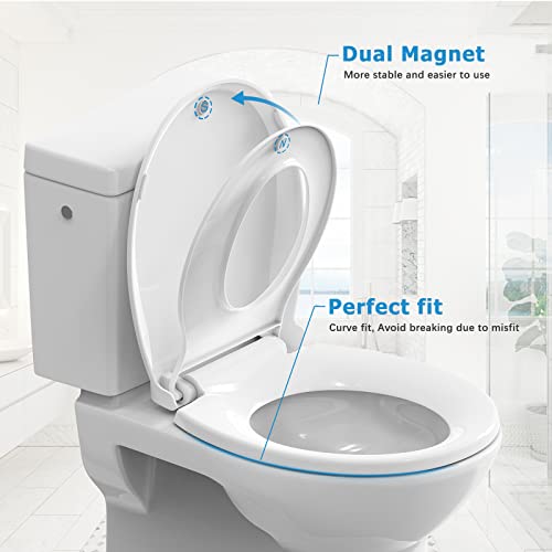 Round Toilet Seat with Built in Potty Training Seat, Potty Training Toilet Seat for Toddlers, Magnetic Kids Seat and Cover, Slow Close and Never Loosen, Fits both Adult and Child, White Round
