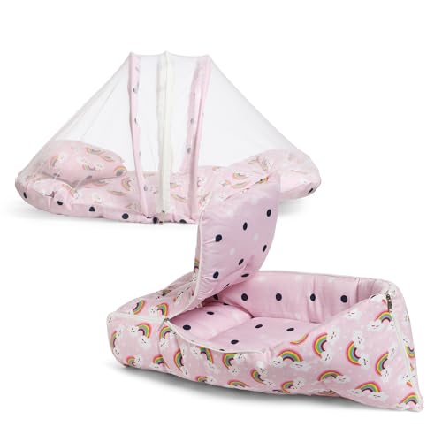 - COMPLETE BABY SLEEPING COMBO: 1. Includes a soft cotton baby mattress with mosquito net and a 3-in-1 baby sleeping bag that doubles as a day bed and carry nest for ultimate convenience.
