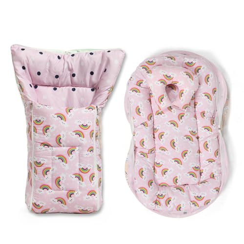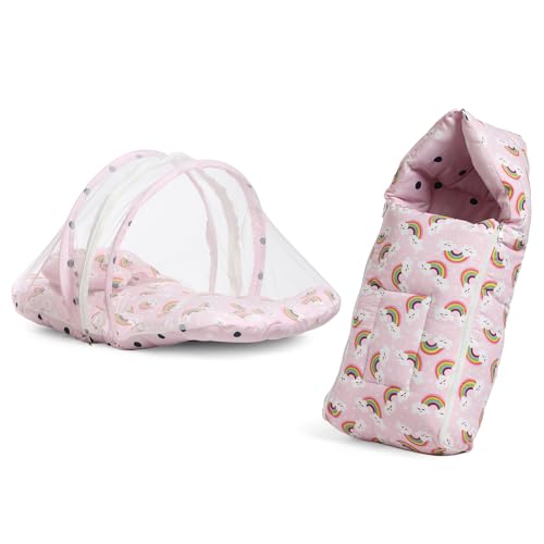 SEANK Combo Pack of Cotton Baby Bedding Set with Mosquito Net and 3 in 1 Sleeping Bag Cum Carry Nest (Pack of 2) (Rainbow Print)