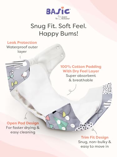 Superbottoms Basic Leakage-proof advanced cloth diapers for babies, High Absorbent 100% cotton 5 reusable diaper and 5 insert pad Combo Pack washable cloth diaper 3M -3Years Adjustable, Reduces Rash