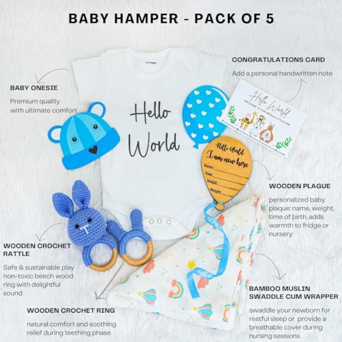 The Baby First Box New Born Newborn Bundle: Onesie, Muslin Swaddle, Crochet Rattle and Baby Announcement Plaque | Baby Shower Gifts | Baby Gift Hamper | Pack of 5